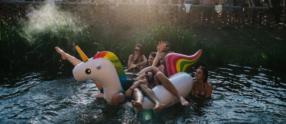 Ein schwimmendes Einhorn vor der Bühne, auf dem eine Handvoll Menschen reitet? So etwas gibt’s nur am Lake on Fire!